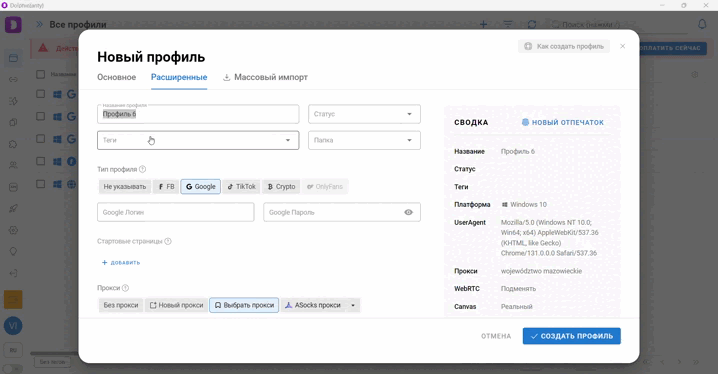 Качественная подмена браузерных отпечатков это самая важная и основная задача любого антидетект браузера. От этого зависит сколько времени «проживет» ваш аккаунт на любом сайте, а также возможность создания аккаунта без бана после регистрации.