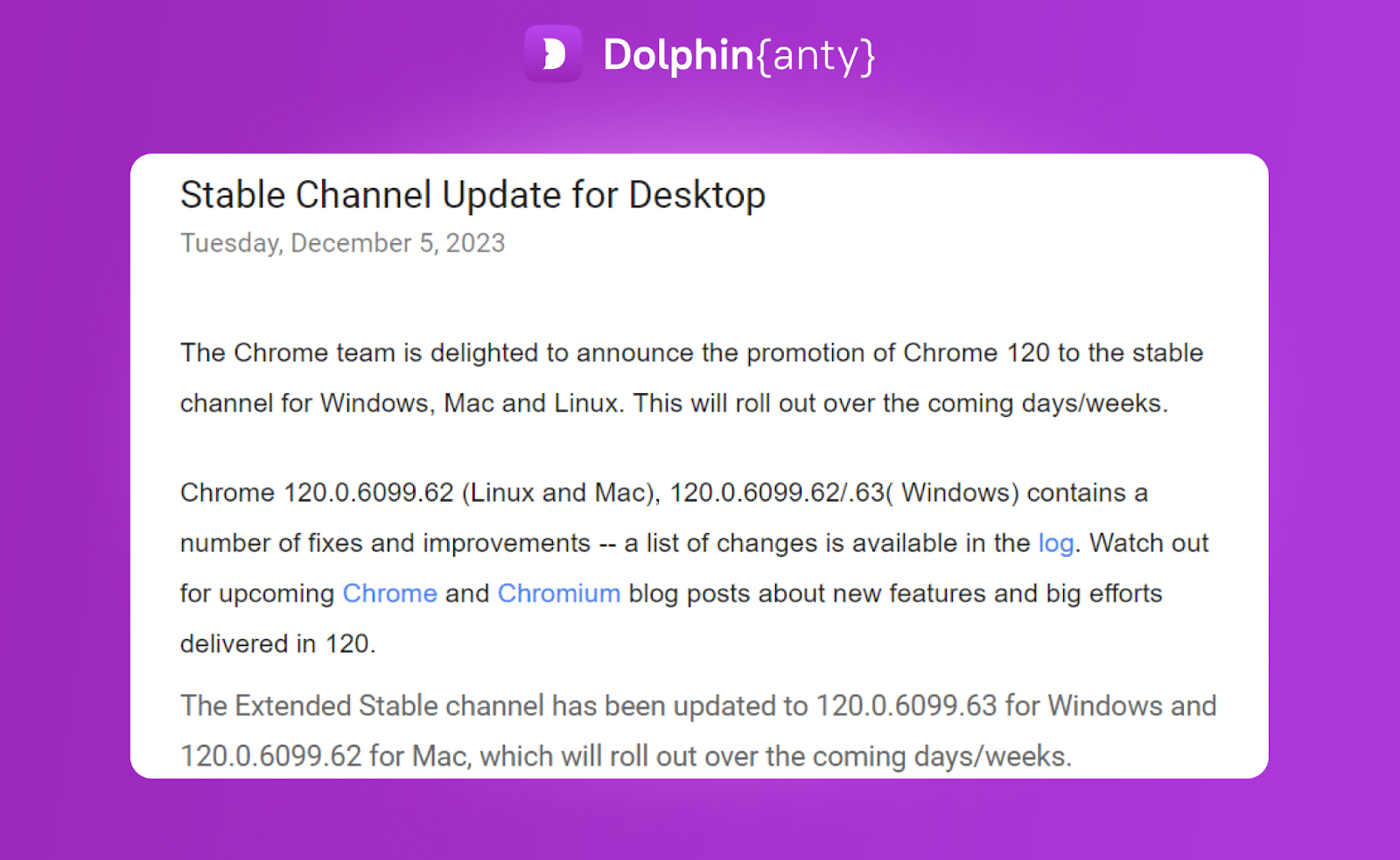 Мы часто пишем, что первыми обновляем ядро Chromium в Dolphin anty и всегда оповещаем об этом своих пользователей. Например, последнее обновление ядра Chromium до 120 версии мы выкатили 14 декабря 2023 года.
